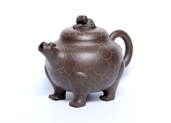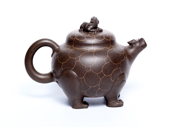 鸿运壶取材古代吉祥动物之形体,和龙狮一样,有将邪气赶走、带来欢乐和好运,且趋财旺财和镇宅避邪的作用。该壶动物神态活泼、纹理清晰、雕琢精细,为观赏祈福之收藏佳品。